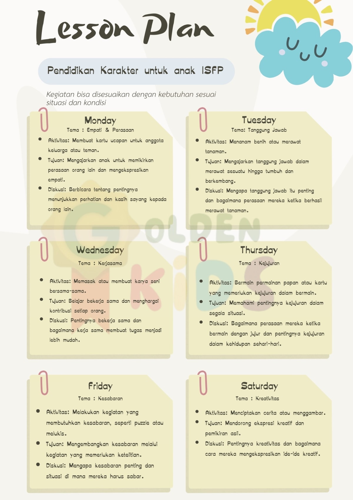 Seni Visual: Mengingat kecenderungan kreatif mereka, les seni seperti menggambar, melukis, atau kerajinan tangan bisa sangat menarik bagi anak-anak ISFP. Kegiatan ini memungkinkan mereka untuk mengekspresikan diri dan mengasah keterampilan artistik mereka.